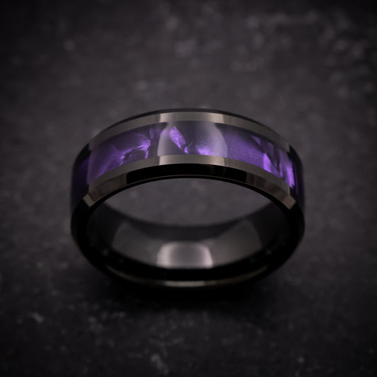 Black Tungsten Ring with Purple Cypraea Tigris Inlay