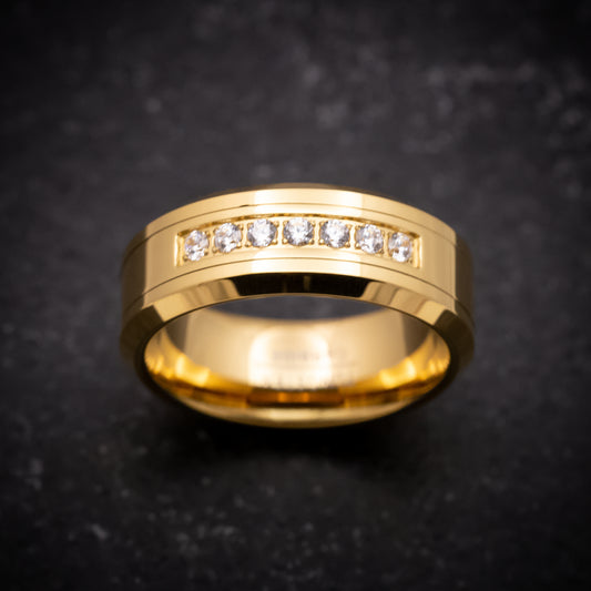 Yellow Gold Tungsten Ring with White Stones