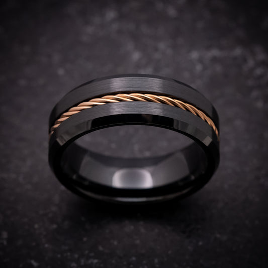 Black Tungsten Ring with Rose Gold Rope Inlay