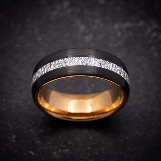 Black and Rose Gold Tungsten Ring with Faux Meteorite Inlay