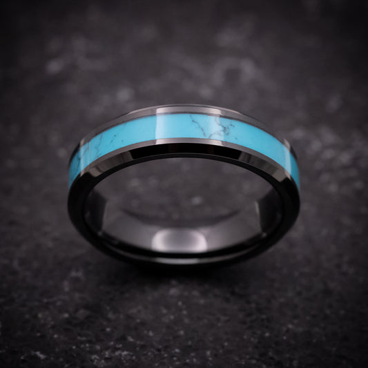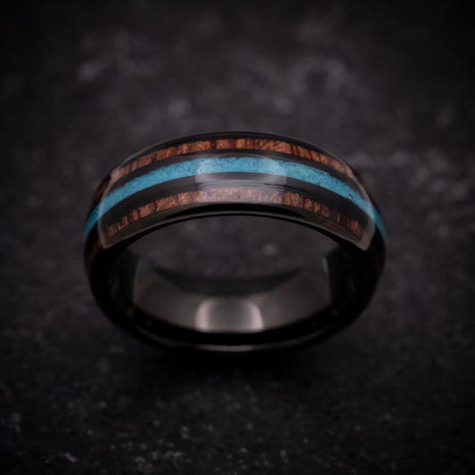 Black Tungsten Ring with Hawaiian Koa Wood and Turquoise Inlays