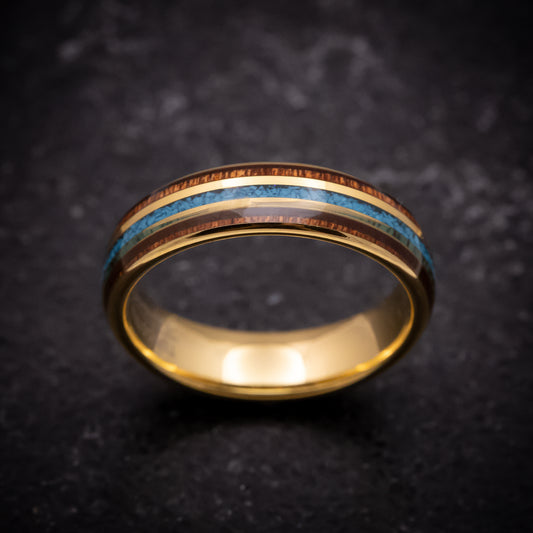 Yellow Gold Tungsten Ring with Rose Wood and Turquoise Inlays