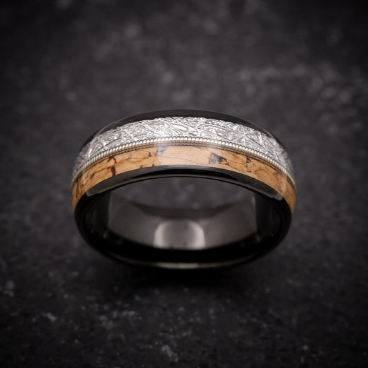 Black Tungsten Ring with Whiskey Barrel Wood and Antler Inlay